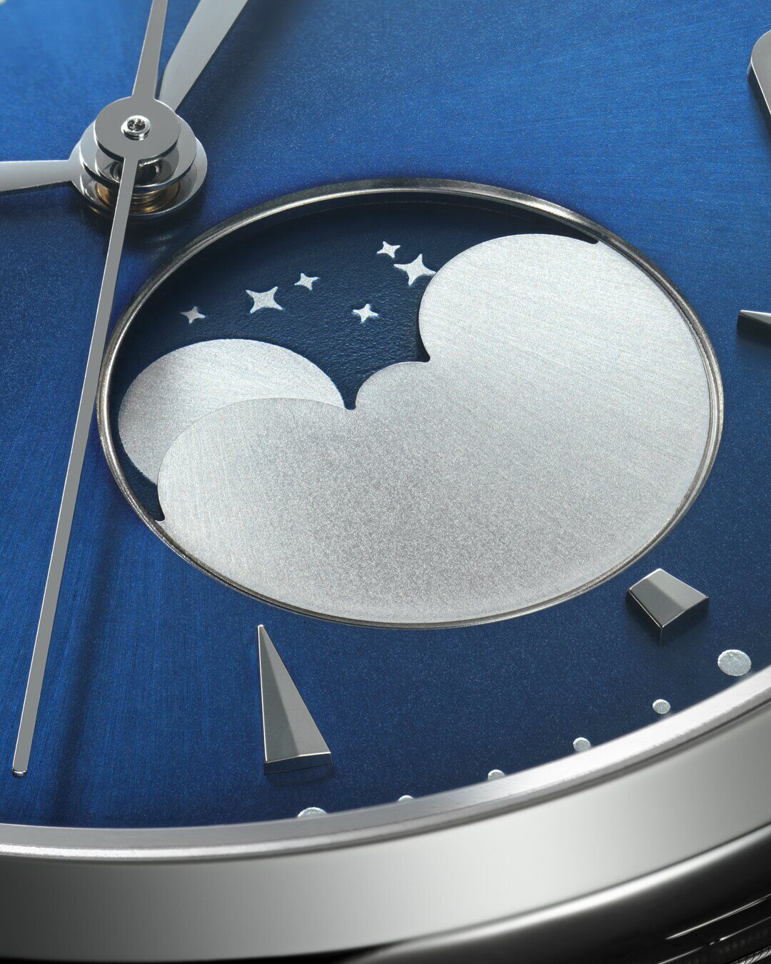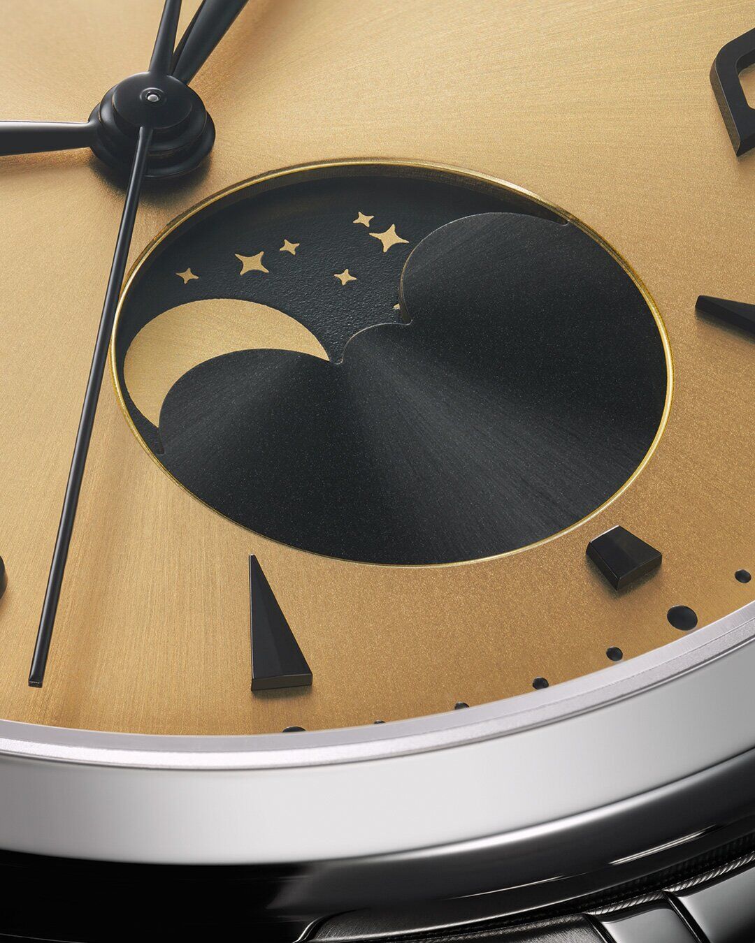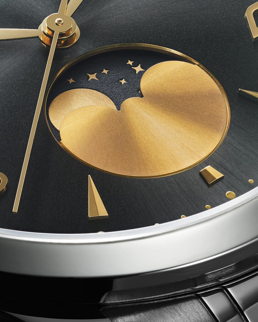 The moon phase indicator for each dial is distinct, and Jay’s vision for the champagne-colour dial model has come to life in a truly fantastical way, with the phantom moonlight gold disc representing the moon hidden behind an inky black cutout that slowly disappears as the moon waxes and wanes