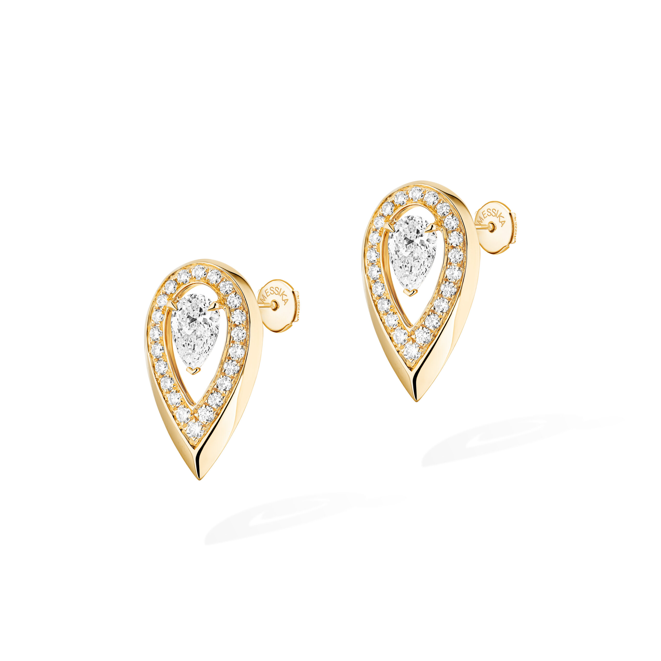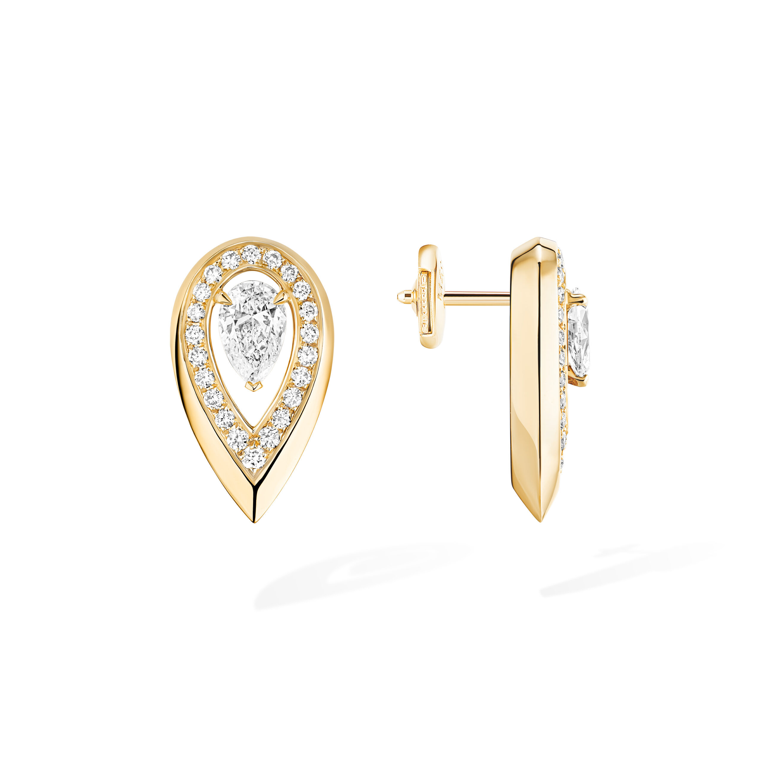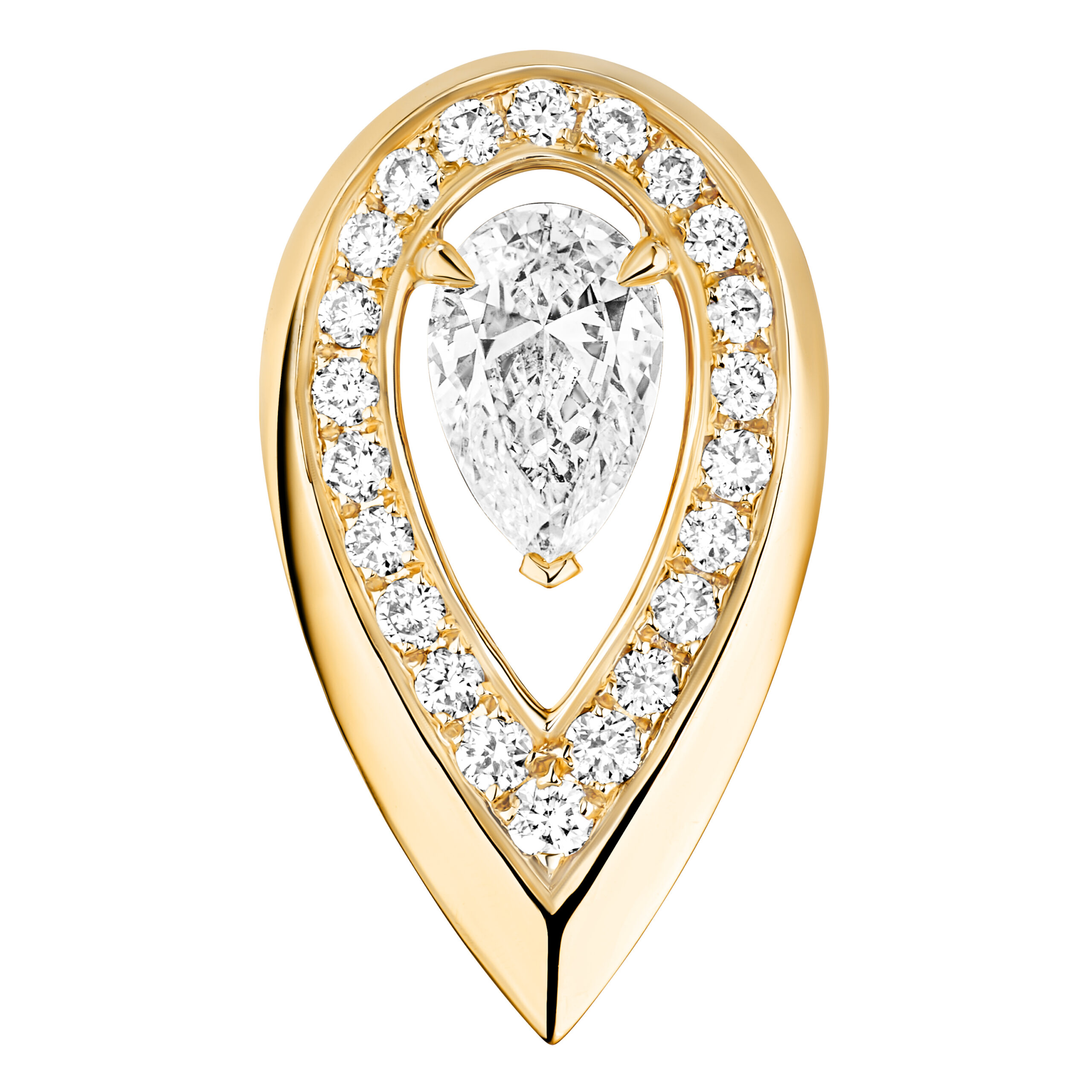 A gold and diamond flame on your ear! What could be more elegant? With Fiery, Valérie Messika has created a sharp jewelry collection for women who wear diamond jewelry as a way of expressing their personality. With these timeless earrings, the collection's iconic motif takes on its full meaning: the pear-cut diamond is enhanced by a gradient pavé setting and gold with resolutely assertive contours. It's up to you to decide the look that best suits your ear: on its own or stacked, symmetrically or asymmetrically? Whatever you decide, you won't go unnoticed with Fiery!