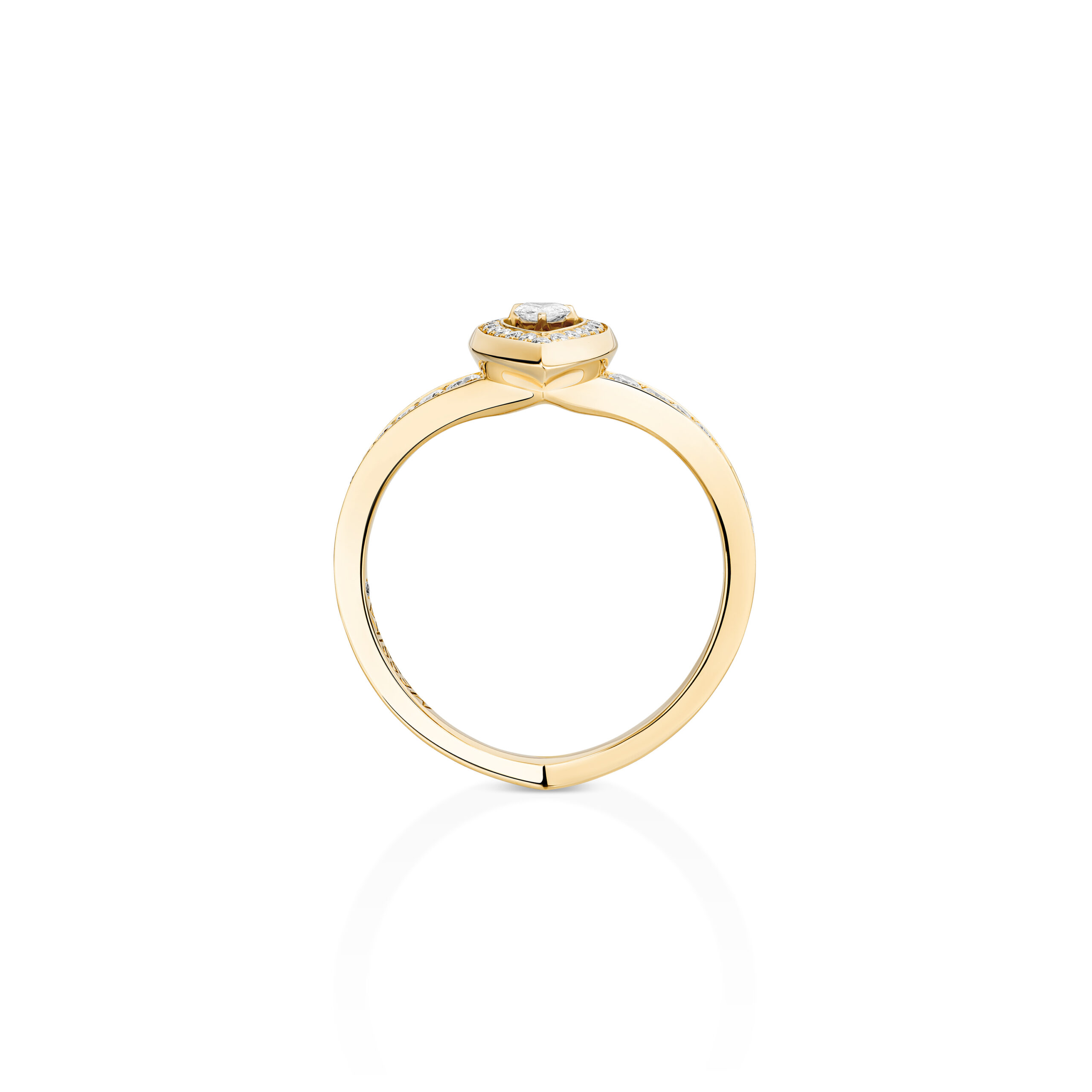 The ultimate timeless and original diamond ring! With this creation from the Fiery jewelry collection, Valérie Messika has designed a gold and diamond ring that enhances the finger and gives the wearer extra confidence. The central diamond is magnified by a gradient pavé setting and a yellow gold band that adds volume and boldness. This is the Maison's signature play of contrasts, between the delicacy of the sensual pear cut, which elongates the finger, and the gold with its precise, pointed contours. A design with character, for those who aren't afraid to assert themselves!