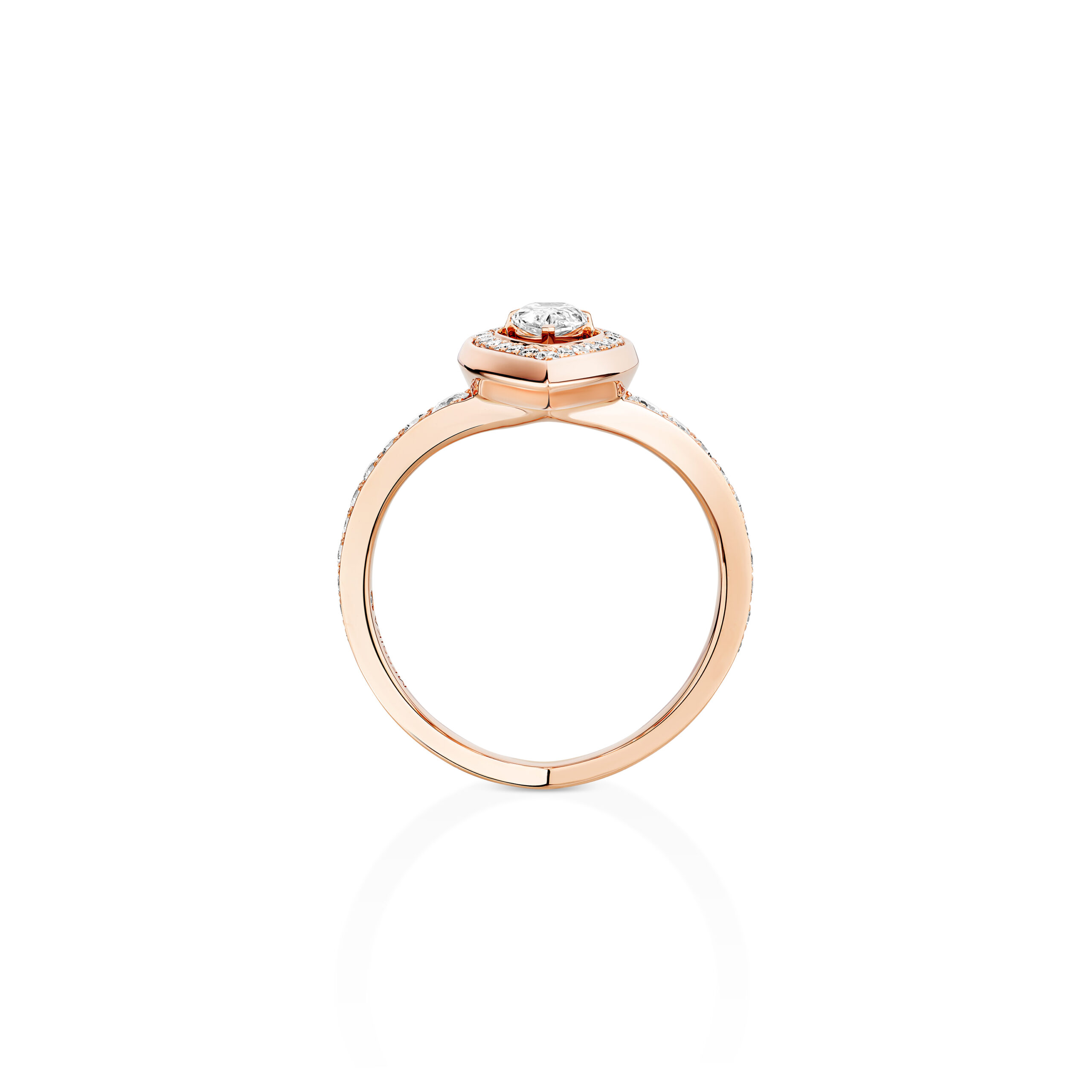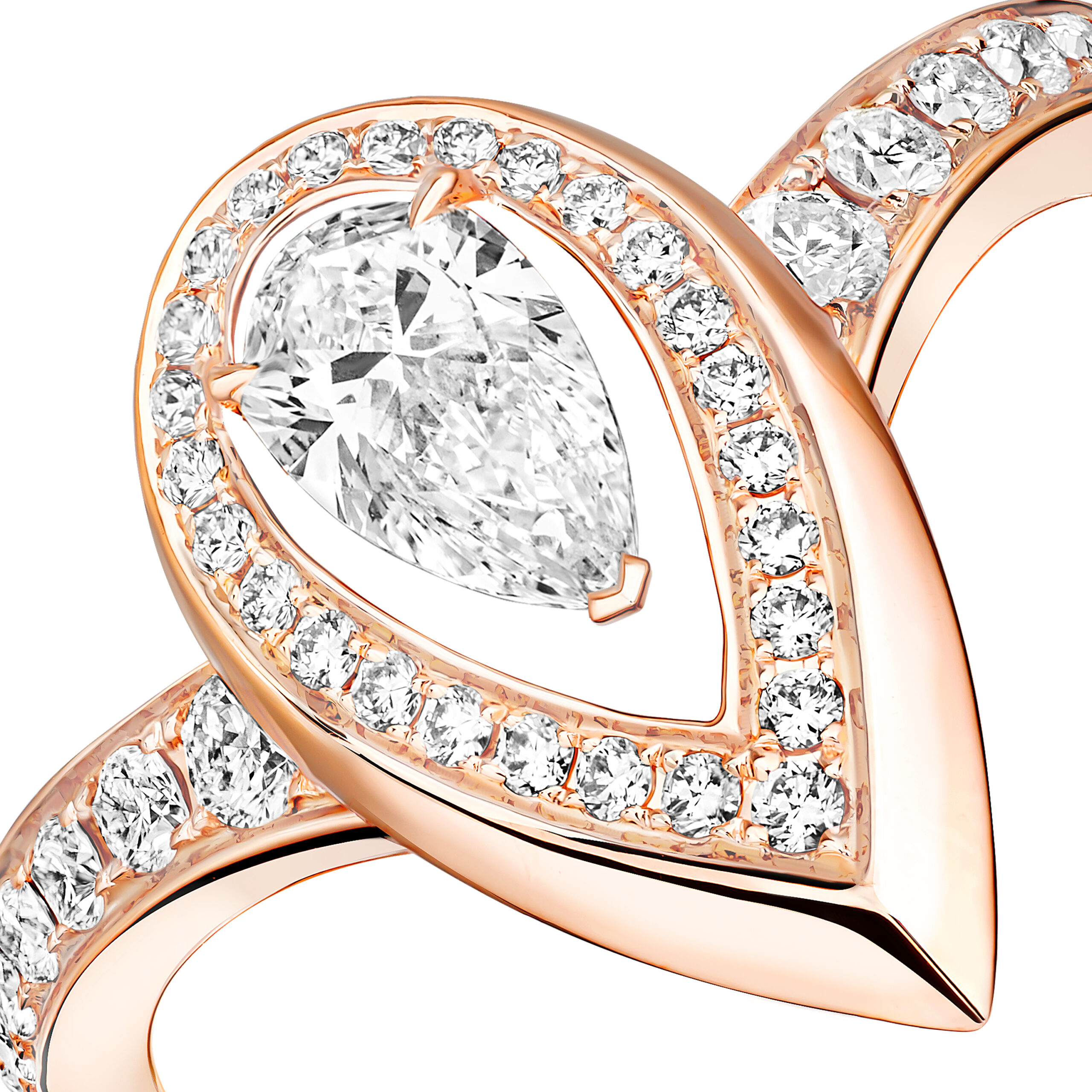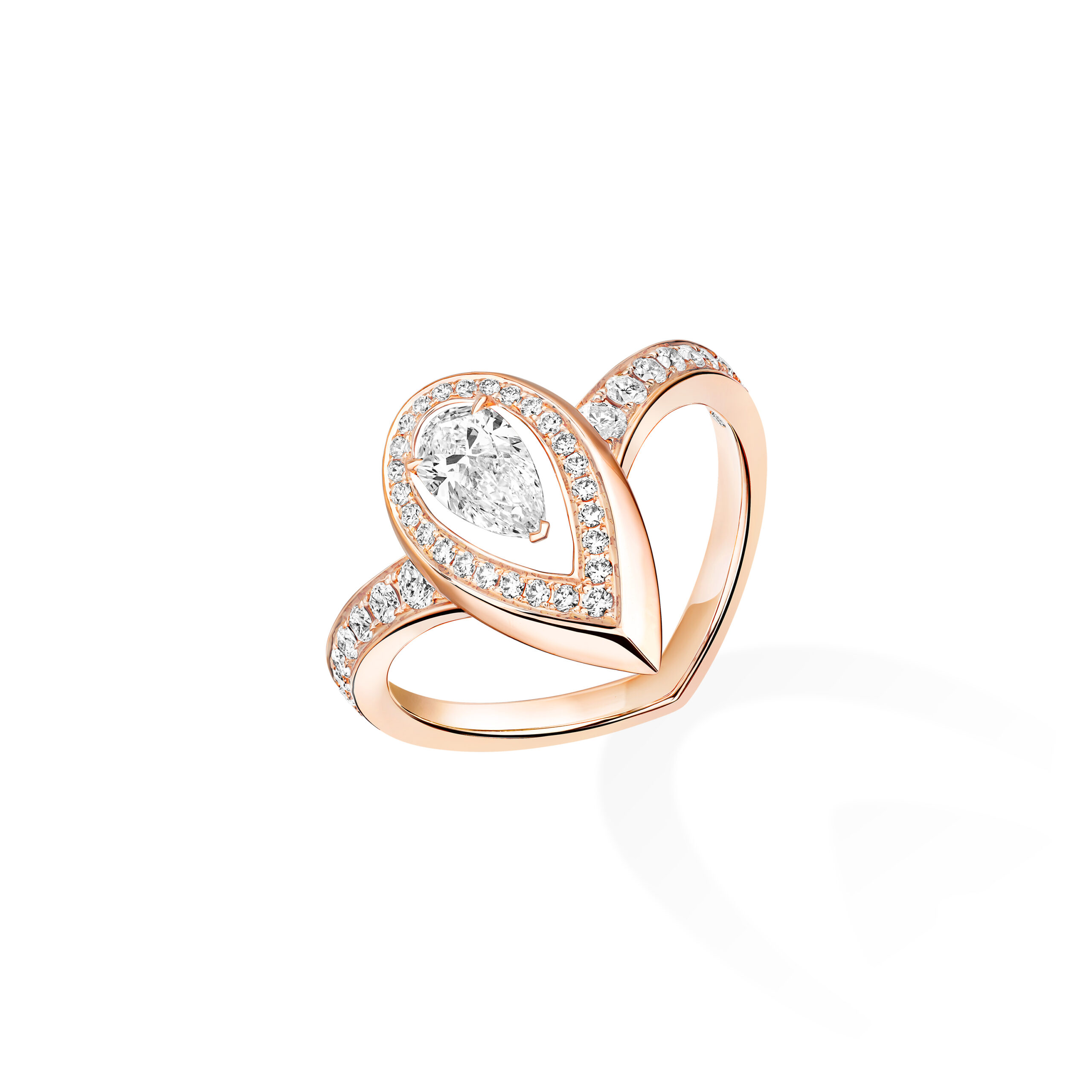 Bold. Sharp. Original. Resolutely timeless. The ultimate Messika luxury ring! This creation from the Fiery jewelry collection embodies some of the Maison's signature codes: spacing between stones and pavé settings, pear cuts and graphic minimalism... A diamond ring with character that draws its strength from the combination of the sensual, flattering pear-cut diamond and pink gold, with its bold contours. For those who aren't afraid to express their personality to the last detail!