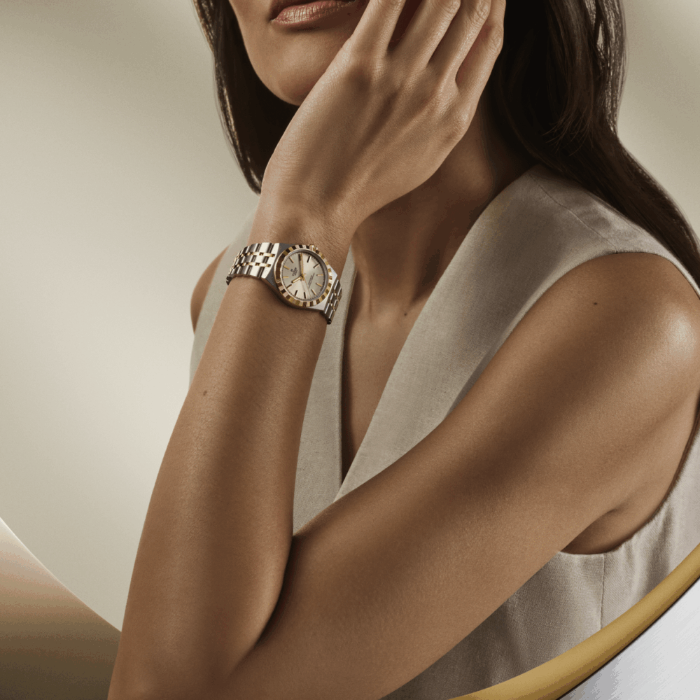 Screw-down winding crown with the TUDOR logo in relief. Steel covered by a 0.1mm yellow gold cap